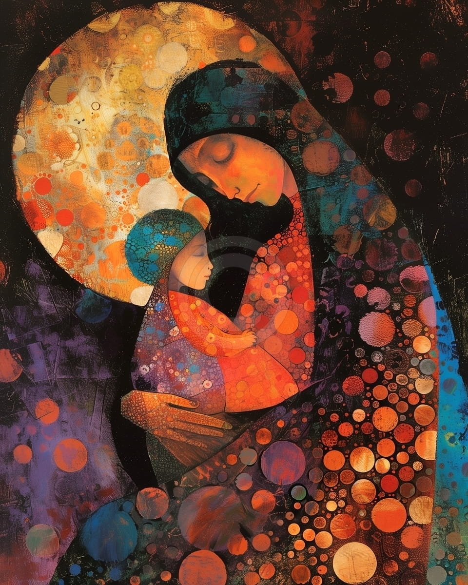 Acest tablou arata o mama care isi tine copilul in brate, realizat intr-un stil simbolic, cu cercuri colorate si forme simple. Culorile sunt calde, cu portocaliu, rosu si auriu, alaturi de accente de albastru si mov. Expresiile celor doi arata afectiune si protectie, creand o atmosfera apropiata. Cercurile luminoase din fundal scot in evidenta legatura dintre mama si copil. Imaginea transmite caldura si o stare linistita. Este un tablou potrivit pentru spatii cu sens emotional sau personal, unde poate aduce sensibilitate si echilibru.