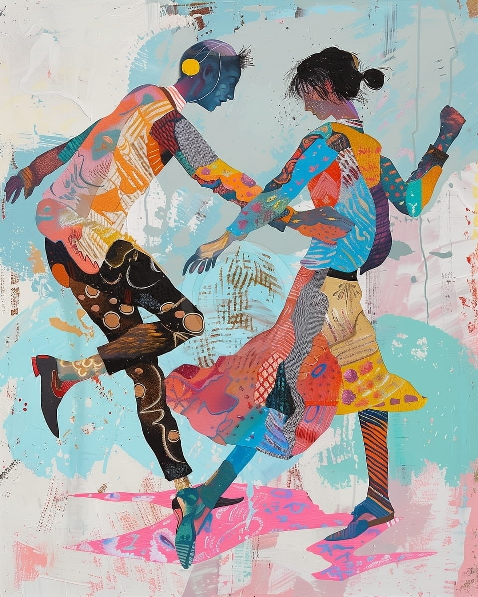 Acest tablou plin de energie arata un cuplu care danseaza cu entuziasm, pe un fundal abstract in culori pastel. Personajele sunt desenate simplu, cu forme stilizate si culori vii, care le scot in evidenta miscarea. Hainele au detalii geometrice si texturi care adauga interes imaginii. Fundalul este realizat cu stropi si forme libere, care dau senzatia de ritm si libertate. Tabloul transmite bucurie si placerea de a dansa. Este potrivit pentru un spatiu creativ, un living modern sau o cafenea artistica, unde poate aduce viata si culoare.