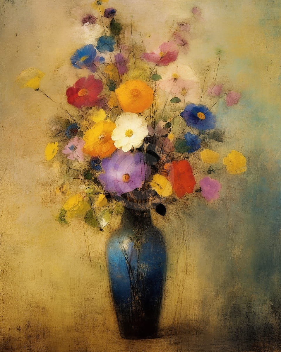 Tabloul arata un buchet bogat de flori colorate asezate intr-o vaza albastra eleganta. Culorile sunt vii – rosu, galben, mov, alb si albastru – si dau o senzatie de prospetime si bucurie. Fundalul este usor estompat, in tonuri calde si deschise, ceea ce face florile sa iasa mai bine in evidenta. Stilul este simplu si placut, potrivit pentru decorul unui living sau al unui dormitor. Tabloul transmite liniste si o stare buna, aducand farmecul florilor in interiorul casei. Este o alegere potrivita pentru cei care iubesc florile si decorurile elegante.