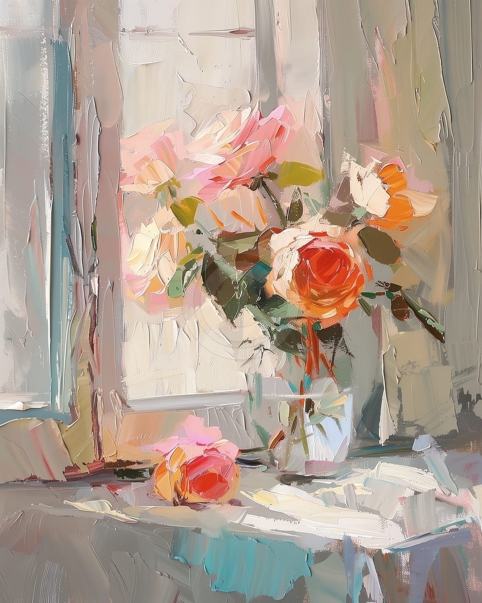 Tabloul prezinta un buchet de trandafiri in nuante de portocaliu si roz, asezat intr-o vaza simpla langa o fereastra. Lumina calda care patrunde in incapere scoate in evidenta textura florilor si tusele bogate de culoare. Fundalul este realizat in tonuri neutre de gri si bej, cu accente de albastru deschis care echilibreaza compozitia. Stilul este expresiv si pictural, cu o abordare moderna a unei naturi statice. Atmosfera este calma si intima, punand in valoare frumusetea simpla a florilor. Este un tablou potrivit pentru livinguri luminoase, holuri sau pentru un colt elegant de relaxare.