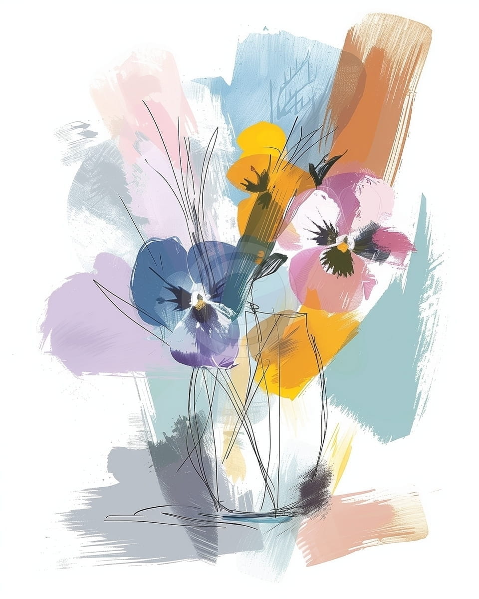 Acest tablou modern prezinta un buchet de flori intr-o vaza, realizat prin linii subtiri si pete de culoare expresive. Florile apar in nuante de mov, galben si roz, iar fundalul include accente de albastru si portocaliu care aduc dinamism compozitiei. Desenul este simplu si aerisit, iar contrastul dintre liniile fine si zonele de culoare creeaza un efect vizual placut. Vaza este sugerata prin cateva linii minimaliste, oferind imaginii un aspect modern si artistic. Tusele libere si culorile vii adauga energie si prospetime scenei. Acest tablou se potriveste bine in interioare contemporane sau spatii creative, aducand un accent decorativ discret si elegant.