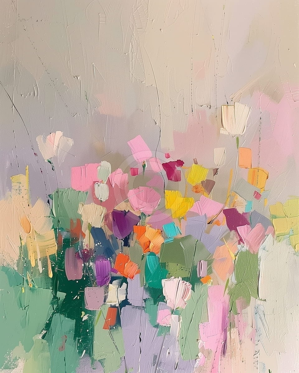 Tabloul arata un camp plin de flori in culori pastel si vii, precum roz, galben, lila, portocaliu si verde. Florile sunt realizate cu tuse groase si libere, care dau un aspect bogat. Fundalul este deschis, in tonuri de crem si mov pal, oferind lumina imaginii. Compozitia transmite prospetime si o stare de bucurie. Stilul este modern si usor de remarcat. Este un tablou potrivit pentru living sau alte spatii, unde aduce culoare si o stare pozitiva.