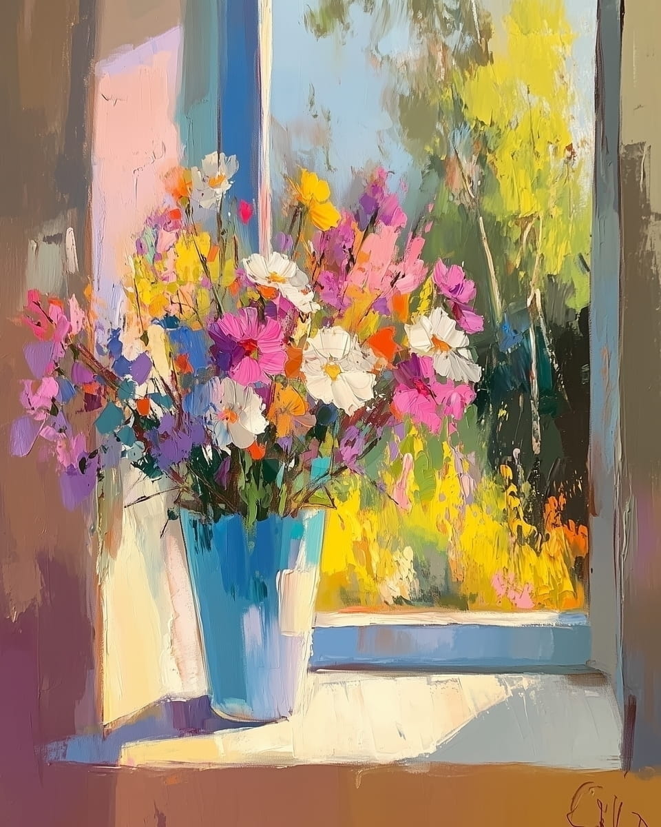 Acest tablou vibrant infatiseaza un buchet generos de flori colorate in nuante de alb, roz, galben si mov, asezat intr-un ghiveci albastru pe un pervaz luminat de soare. In fundal se observa o gradina scaldată in lumina aurie a verii, cu vegetatie luxurianta si cer senin. Pensulatia este energica si expresiva, cu tuse vizibile ce adauga dinamism si textura. Compozitia transmite caldura, prospetime si o atmosfera vesela de dupa-amiaza linistita. Culorile intense si contrastul luminii solare creeaza o senzatie de vitalitate si libertate. Tabloul este ideal pentru spatii luminoase, aducand o nota de optimism si bucurie naturala.
