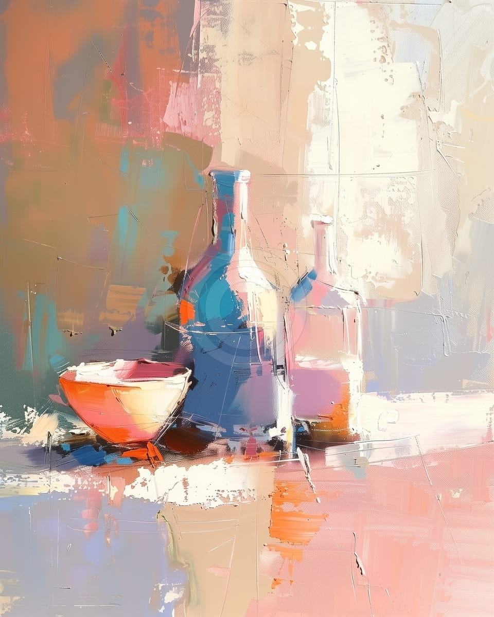 Acest tablou prezinta o natura statica moderna, in care doua sticle si un bol sunt redate prin forme simplificate si tuse expresive, cu un aer relaxat si echilibrat. Paleta cromatica calda, dominata de roz, bej si portocaliu, este completata de accente de albastru care adauga contrast si vitalitate. Fundalul este construit in straturi suprapuse, cu zone fragmentate ce creeaza senzatia de profunzime si miscare subtila. Lumina este sugerata delicat prin variatii de ton, oferind volum obiectelor fara a le incarca cu detalii. Compozitia ramane aerisita si armonioasa, pastrand un stil modern si decorativ. Acest tablou se potriveste perfect intr-un dining, o bucatarie moderna sau un living luminos, unde aduce culoare si rafinament prin simplitate.