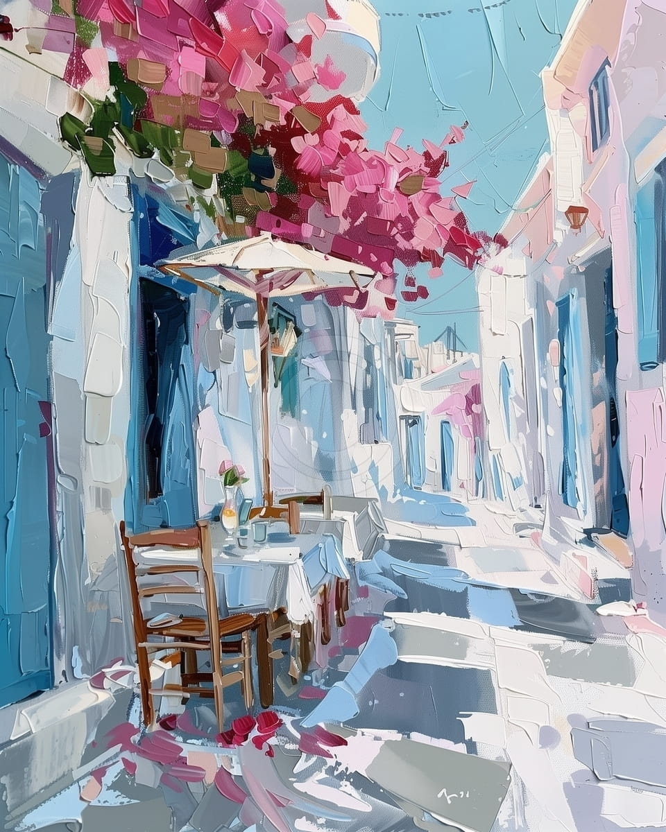Tabloul arata o strada ingusta si luminoasa dintr-un sat mediteranean, cu o terasa simpla cu masa si scaune din lemn. Florile roz se intind peste peretii albi ai cladirilor si creeaza un contrast placut. Stilul este modern, cu pensulatii groase si textura vizibila. Lumina puternica si umbrele dau senzatia unei zile calde de vara. Compozitia este clara si usor de privit. Tabloul transmite o stare de relaxare si vacanta. Este potrivit pentru spatii luminoase, rustice sau boeme, aducand un aer placut si cald.