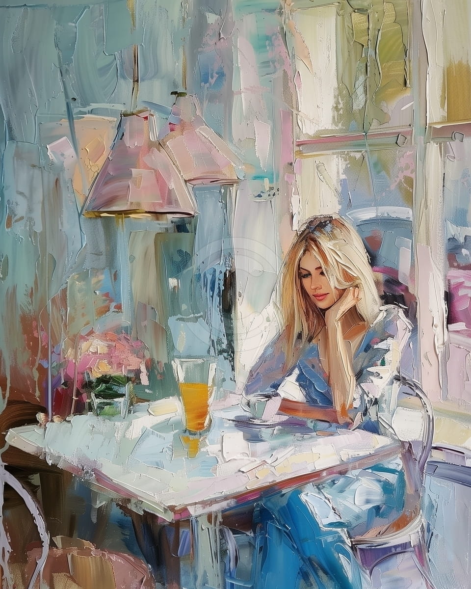 Acest tablou arata o femeie eleganta, cu par blond si haine albastre, asezata la o masa de cafenea intr-un interior luminos si modern. In fata ei se afla un pahar cu suc si o ceasca, iar expresia usor trista sugereaza un moment de gandire sau relaxare. Fundalul este realizat cu tuse largi si luminoase, in culori pastelate de albastru, roz si bej. Luminile de sus si reflexiile de pe masa aduc mai multa adancime si o atmosfera calda. Imaginea transmite liniste, feminitate si bun gust. Este un tablou potrivit pentru spatii elegante sau camere personale, unde poate aduce o nota placuta si intima.