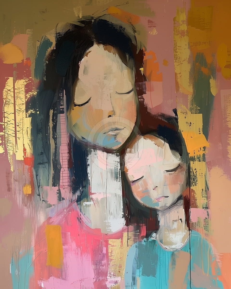 Acest tablou modern arata o mama care isi tine copilul aproape, amandoi cu ochii inchisi, intr-o stare de liniste si apropiere. Culorile sunt calde, cu roz, portocaliu, galben si albastru deschis, puse in straturi libere. Formele sunt simple, dar exprima bine emotia, fara multe detalii realiste. Fundalul are textura si ajuta la ideea de sustinere si unitate. Imaginea transmite iubire si legatura puternica intre mama si copil. Este un tablou potrivit pentru interioare moderne, unde poate aduce o stare placuta si apropiata.