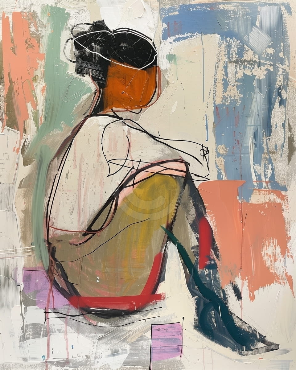 Acest tablou abstract redă silueta unei femei asezate, surprinsa intr-o pozitie introspectiva, cu genunchii ridicati si bratele cuprinzand corpul. Contururile sunt trasate cu linii negre expresive si libere, in timp ce suprafetele sunt umplute cu tuse de culoare vibranta: portocaliu, mustar, rosu si nuante de albastru. Fundalul este compus din forme neregulate si suprapuneri texturate, oferind dinamism si contrast. Lucrarea transmite o emotie puternica de interiorizare si fragilitate, fiind potrivita pentru spatii moderne ce valorizeaza expresia artistica si individualitatea.
