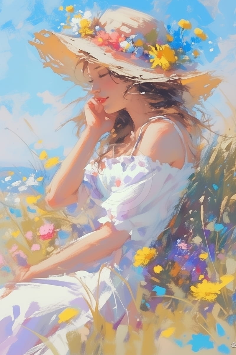 Tabloul prezinta o tanara asezata intr-un camp plin de flori, purtand o rochie alba si o palarie de paie decorata cu flori colorate. Fundalul este luminos, cu cer albastru, ceea ce da imaginii o atmosfera calda de vara. Culorile sunt pastelate si placute, iar liniile sunt fine si simple. Privirea ei calma si postura relaxata sugereaza liniste si apropiere de natura. Compozitia este echilibrata si usor de privit. Tabloul se potriveste bine in incaperi luminoase sau in interioare cu stil feminin ori rustic.