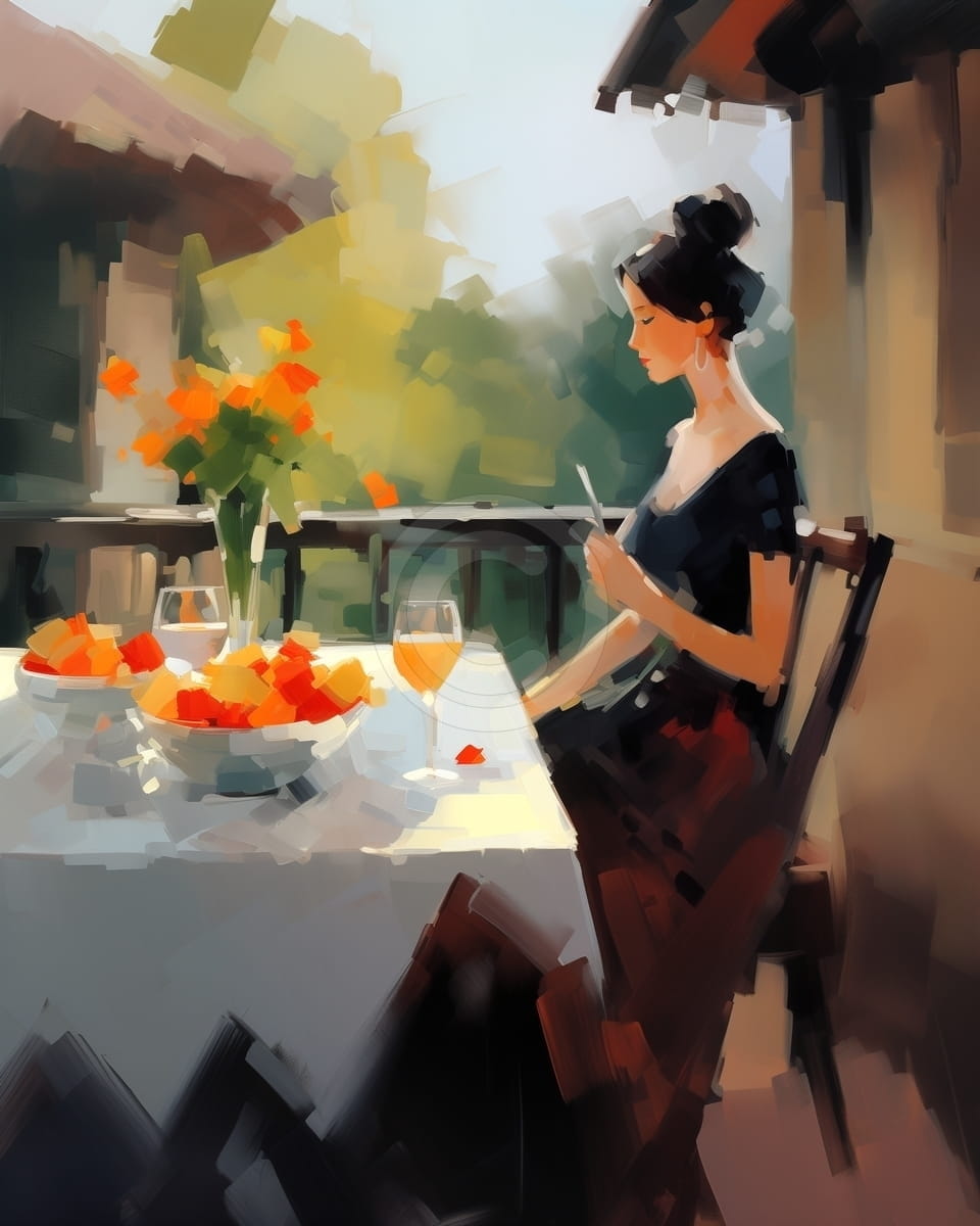 Tabloul prezinta o femeie eleganta asezata la o masa pe o terasa, bucurandu-se de un moment linistit. Pe masa se afla un pahar de vin si un bol cu fructe. Lumina calda a diminetii trece printre frunze si lumineaza usor scena. Culorile sunt pastelate si placute, cu accente de portocaliu si verde. Fundalul este usor estompat, astfel incat figura femeii si obiectele de pe masa ies mai bine in evidenta. Tabloul transmite o atmosfera de relaxare si eleganta, potrivita pentru interioare luminoase si rafinate.