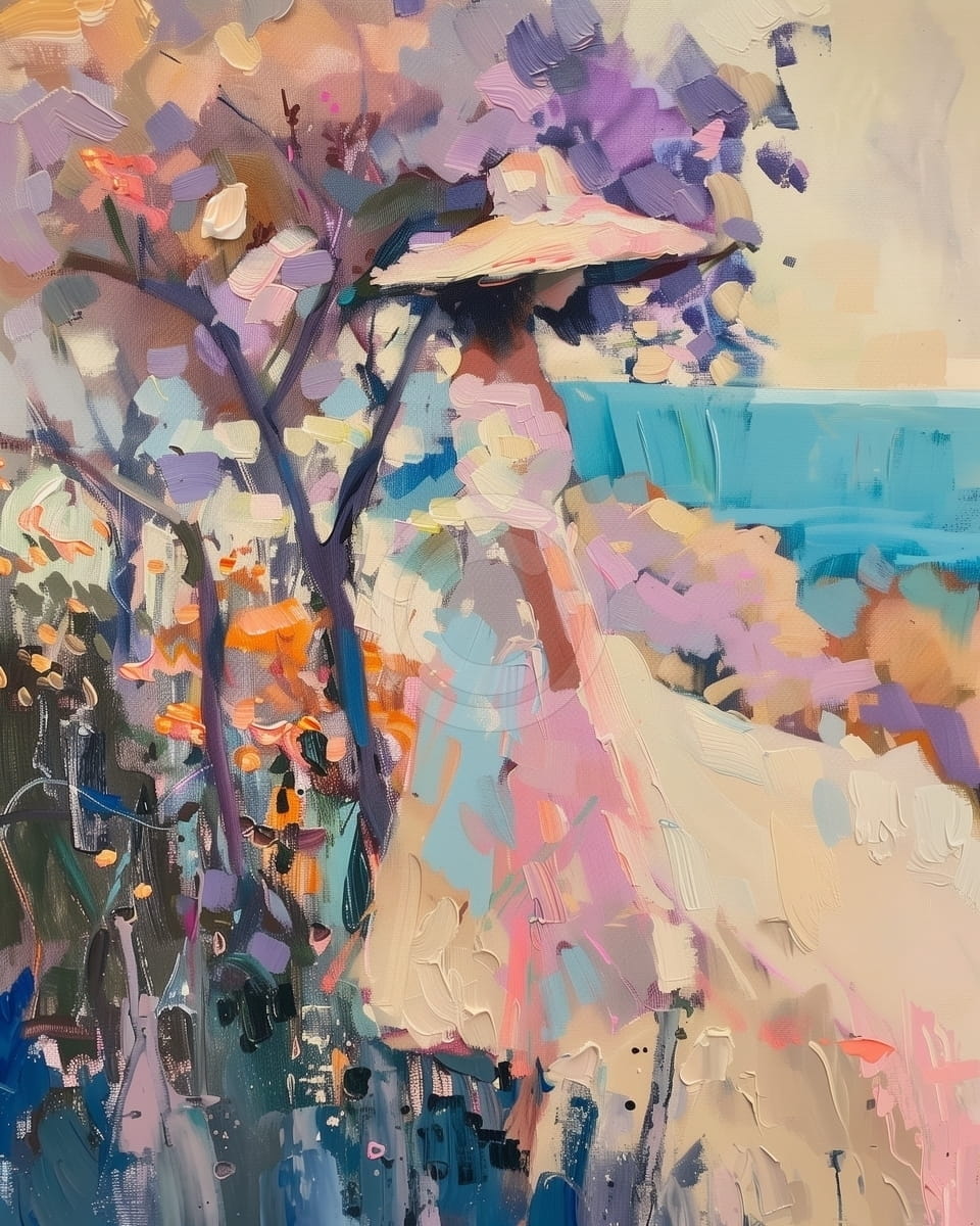 Tabloul prezinta silueta unei femei cu palarie, aflata intr-un peisaj de vara plin de culoare. Tusele de culoare sunt largi si vizibile, iar imaginea are un stil liber si expresiv. Culorile sunt pastelate, in nuante de roz, lila, bleu si crem. Fundalul sugereaza flori si o atmosfera apropiata de mare. Palaria eleganta si rochia usoara dau imaginii un aer romantic. Tabloul transmite lumina si relaxare si se potriveste bine in incaperi luminoase si feminine.
