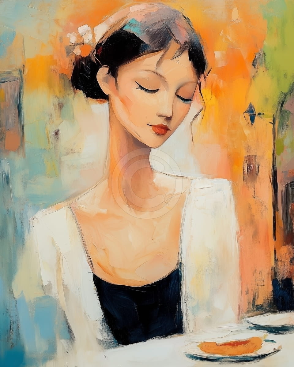 Tabloul prezinta o femeie cu chip delicat si o expresie calma, asezata la o masa simpla pe care se afla o farfurie cu o felie de fruct. Are ochii inchisi si o postura relaxata, sugerand un moment de liniste si contemplatie. Poarta o tinuta eleganta, alba cu top negru, care contrasteaza placut cu fundalul colorat. In spate apar nuante calde de portocaliu, galben si albastru pastelat, ce adauga lumina si profunzime compozitiei. Tusele sunt moi si fluide, iar stilul are un aer modern si expresiv. Este un tablou potrivit pentru un decor boem, contemporan sau pentru un interior luminos si relaxant.