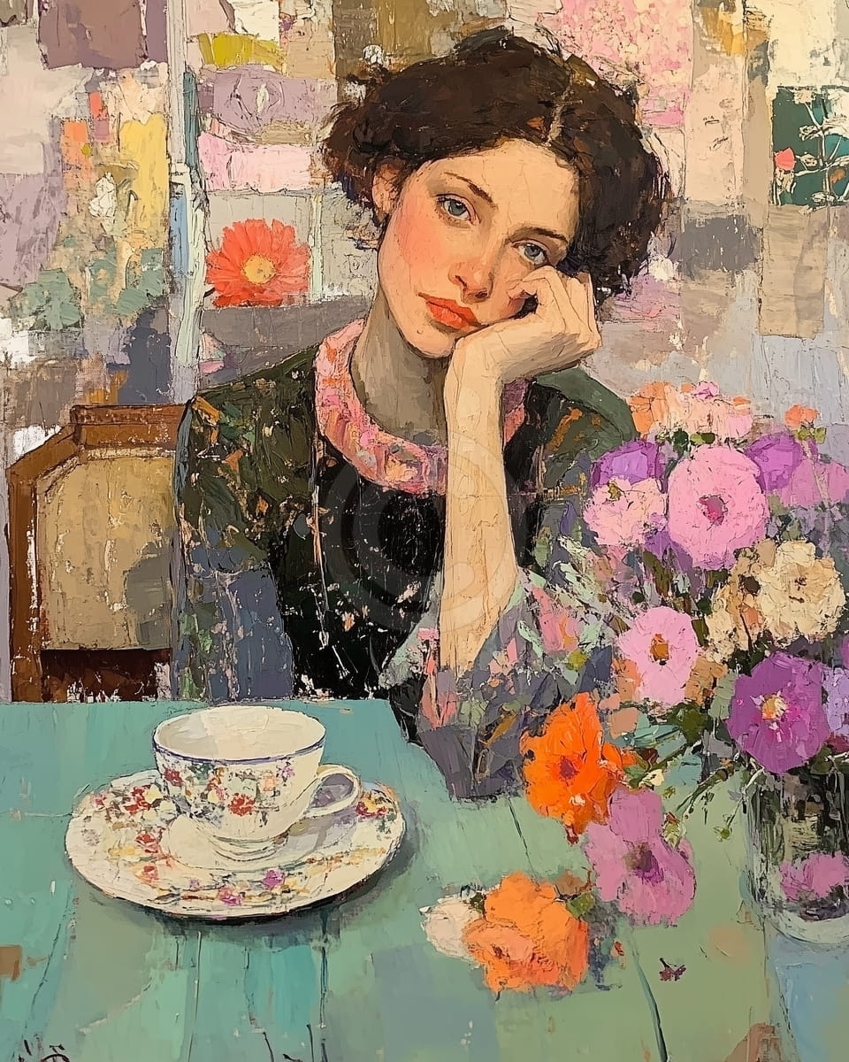 Tabloul arata o femeie cu privirea pierduta, sprijinindu-si capul in palma, asezata la o masa cu flori si o ceasca de ceai cu model floral. Fundalul este realizat din tuse libere si culori deschise, care completeaza o atmosfera calma si usor nostalgica. Rochia inchisa la culoare, cu detalii florale, si expresia linistita a fetei arata o stare de gandire si relaxare. Masa turcoaz, florile colorate si ceasca decorata aduc un plus de caldura imaginii. Este un tablou care transmite emotie si o stare placuta, potrivit pentru un spatiu personal sau de relaxare. Stilul combina elemente clasice cu unele moderne, oferind un aspect simplu si elegant.