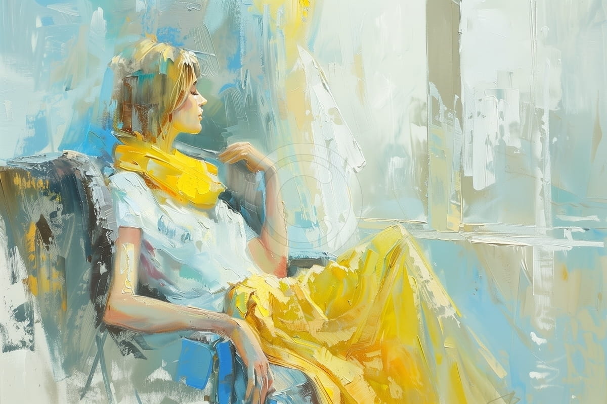 Acest tablou luminos arata o femeie asezata intr-un fotoliu, privind pe fereastra cu o expresie calma si ganditoare. Poarta o esarfa si o fusta galbena, care adauga caldura imaginii. Culorile sunt deschise, cu alb, albastru si galben, sugerand lumina care intra in camera. Tusele sunt libere si vizibile, ceea ce da un aspect proaspat. Tabloul transmite liniste si confort. Este potrivit pentru un dormitor, living sau un colt de lectura, unde poate crea o atmosfera placuta si relaxanta.