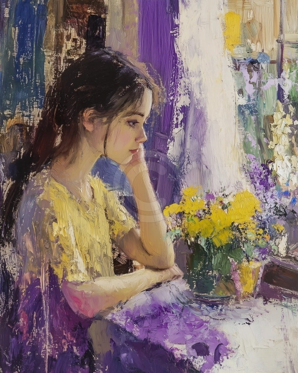 Tabloul reda o scena intima si melancolica, in care o tanara sta la o masa langa o fereastra, privind in gol, cu capul sprijinit in mana. Imbracata intr-un top galben si asezata pe un fundal in nuante de violet si albastru, figura ei delicata contrasteaza cu textura bogata si vibranta a pensulatiei. Pe masa se afla o vaza cu flori galbene si mov, ce adauga prospetime si lumina compozitiei. Atmosfera este una contemplativa, linistita, sugerand un moment de reflectie sau visare. Tabloul este potrivit pentru spatii care doresc sa evoce emotie, sensibilitate si frumusete clasica.