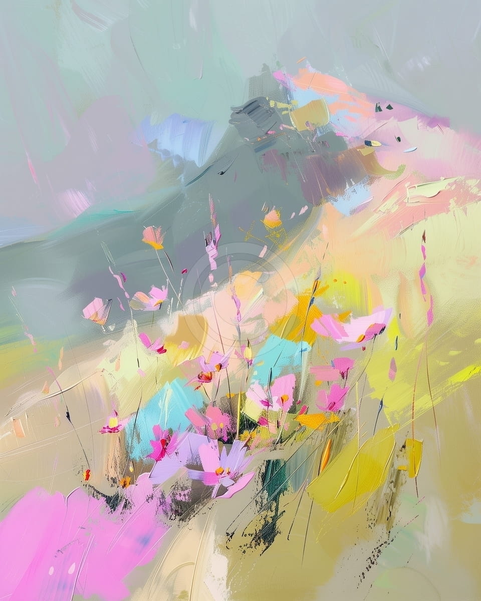 Tabloul prezinta un peisaj stilizat cu flori salbatice in nuante de roz, galben si lila, raspandite pe un camp luminos. Fundalul este realizat in tonuri pastelate de verde, turcoaz, bej si mov, aplicate prin tuse fluide si spontane. Compozitia este aerisita si sugereaza libertatea si linistea naturii. Culorile se imbina armonios, oferind imaginii un aspect calm si luminos. Stilul este modern si expresiv, cu accente abstracte inspirate din peisaj. Este un tablou potrivit pentru decoruri luminoase, spatii de relaxare sau interioare inspirate de natura.