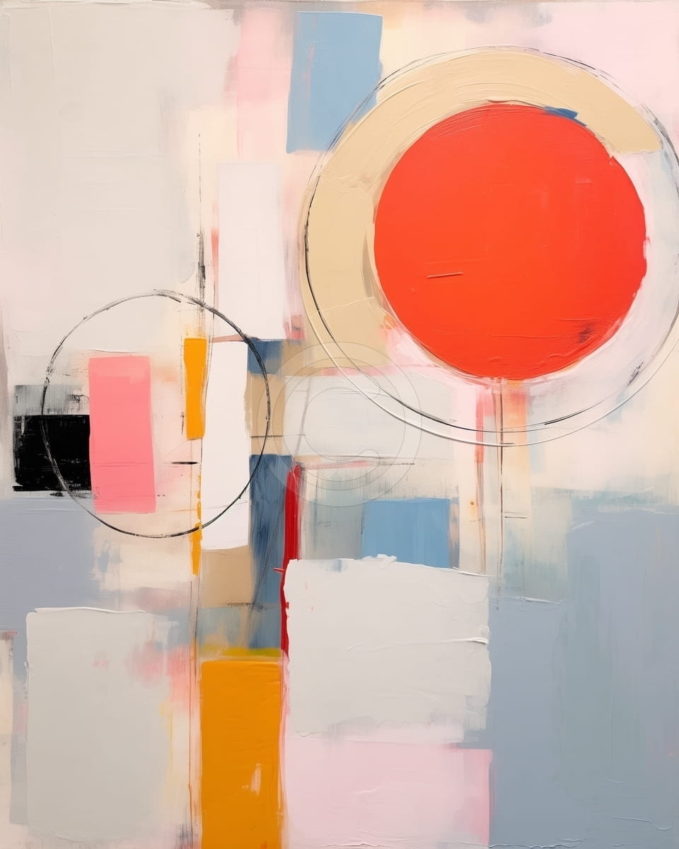 Această lucrare abstractă se remarcă printr-un cerc central roșu vibrant, înconjurat de tonuri calde și reci, într-o compoziție geometrică echilibrată. Fundalul include forme rectangulare în nuanțe de crem, galben, roz, albastru și negru. Liniile subtile și suprapunerile transparente adaugă profunzime și mișcare compoziției. Tabloul transmite energie și structură, fiind potrivit pentru interioare moderne și minimaliste. Este ideal pentru living, birou sau spații de design contemporan, aducând dinamism și culoare oricărui ambient.