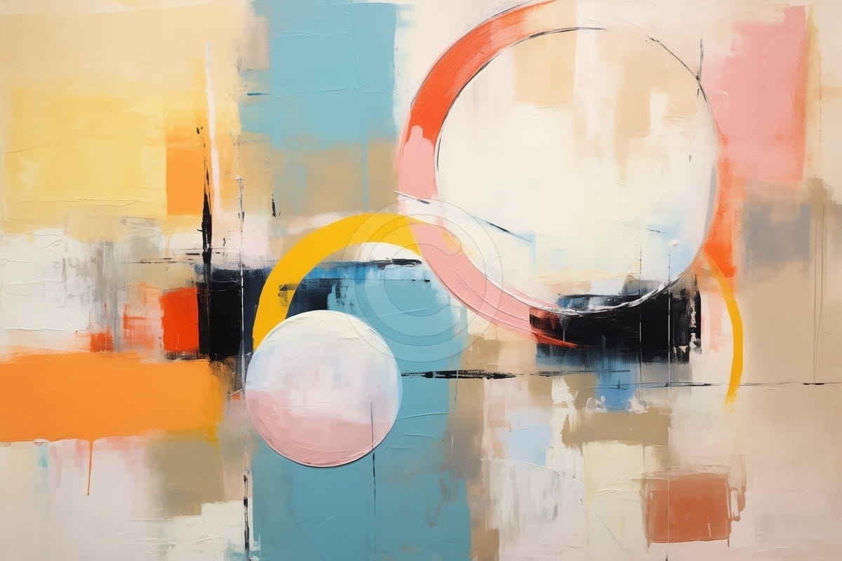 Tabloul arată forme circulare mari și linii colorate în galben, roz, portocaliu, bleu și negru. Compoziția este plină de viață, echilibrată de zonele cu culori mari și contraste puternice. Transmite energie și eleganță prin armonia culorilor. Texturile și suprapunerile fac scena mai adâncă și interesantă. Este potrivit pentru camere moderne, spații creative sau interioare minimaliste, aducând vitalitate și stil într-un mod subtil.