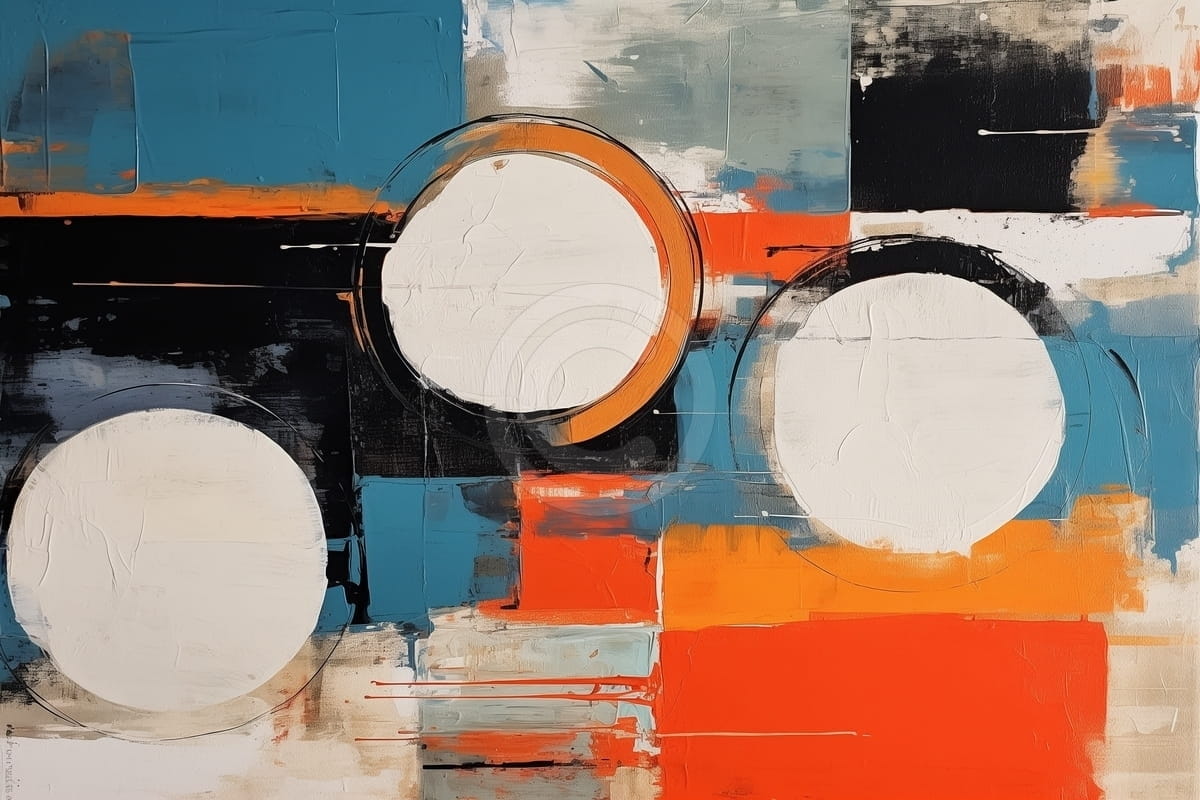 Tabloul reda o compozitie abstracta in care trei cercuri albe devin punctele centrale, plasate pe un fundal bogat in nuante de albastru, portocaliu, negru si crem. Liniile groase si texturile vizibile adauga profunzime si un ritm vizual dinamic. Contrastul dintre formele simple si culorile intense creeaza un impact puternic si echilibrat. Stilul modern pune accent pe claritate si expresivitate, fara a incarca inutil compozitia. Dispunerea geometrica transmite ordine, dar si energie prin jocul cromatic. Este un tablou potrivit pentru interioare contemporane sau birouri, unde poate aduce echilibru si vitalitate.