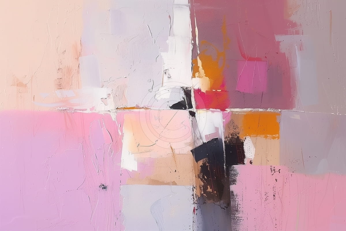 Aceasta lucrare abstracta propune o compozitie construita pe linii de forta orizontale si verticale, care impart suprafata in segmente cromatice distincte. Paleta de culori este dominata de nuante calde de roz, bej, portocaliu si lila, contrastate subtil de pete de negru si alb ce aduc adancime si echilibru vizual. Textura pastoasa si tusele energice sugereaza miscare si expresivitate. Tabloul emana o atmosfera sofisticata si feminina, fiind potrivit pentru decoruri moderne care valorizeaza subtilitatea si echilibrul cromatic.