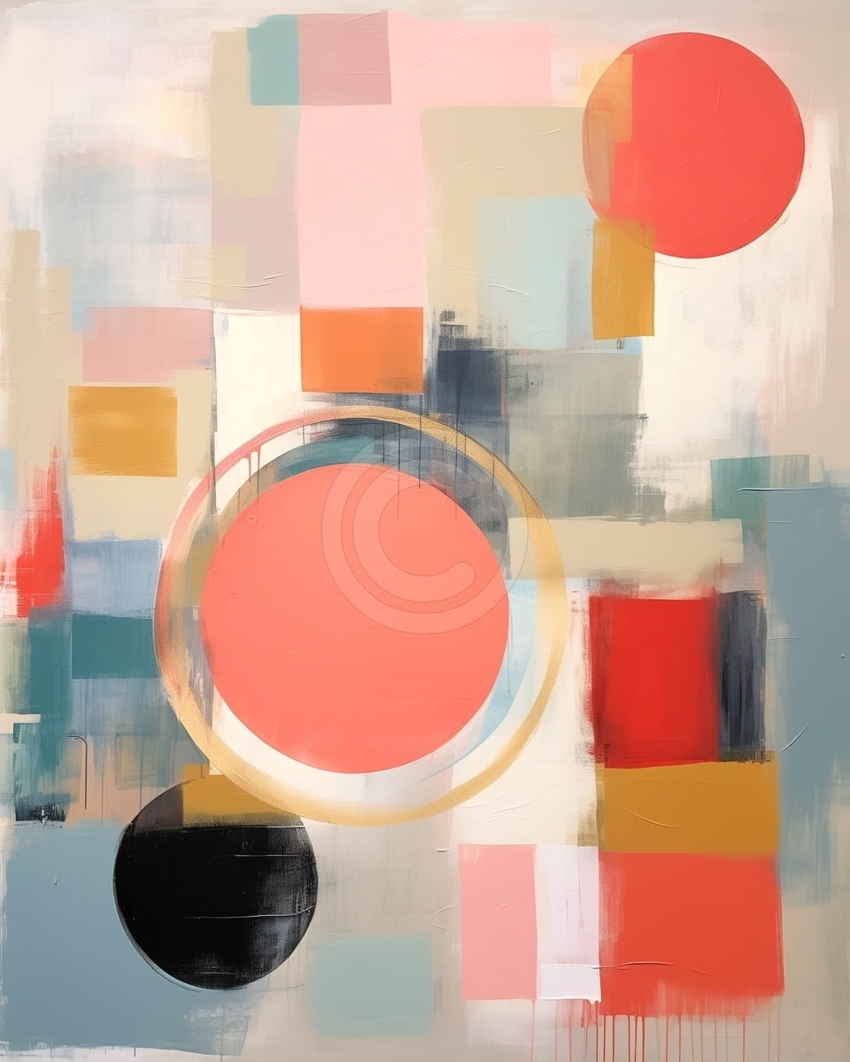 Acest tablou abstract se remarca printr-o compozitie geometrica dinamica, dominata de cercuri mari in nuante de corai, negru si auriu, completate de patrate si dreptunghiuri pastelate. Fundalul este construit in tonuri deschise, cu accente de roz, albastru, mustar si gri, ce creeaza un echilibru vizual placut si modern. Tusele neregulate si marginile uneori estompate sugereaza miscare si fluiditate in cadrul unei structuri riguroase. Lucrarea transmite energie si rafinament, fiind ideala pentru spatii contemporane, birouri sau interioare minimaliste, unde poate deveni punctul central al decorului.