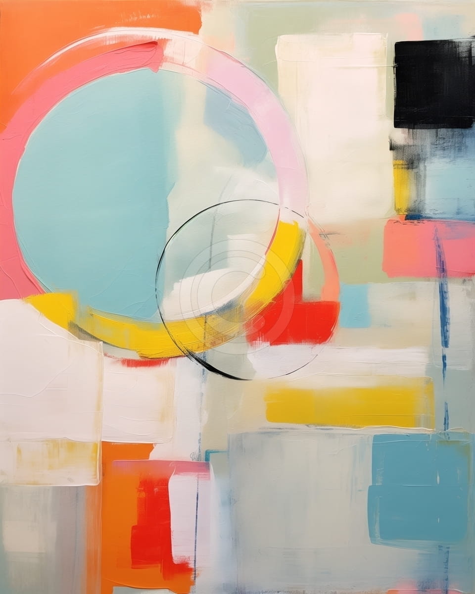 Acest tablou abstract contemporan exploreaza jocul formelor circulare si dreptunghiulare intr-o compozitie echilibrata si dinamica. Culorile vii precum corai, galben, bleu, negru si roz sunt dispuse in straturi vibrante, iar cele doua cercuri suprapuse creeaza un punct central vizual plin de miscare. Fundalul este deschis si aerisit, cu tuse moi si colaje cromatice care sugereaza atat spontaneitate, cat si ordine. Este o lucrare potrivita pentru spatii moderne si creative, oferind energie pozitiva, echilibru si impact vizual.