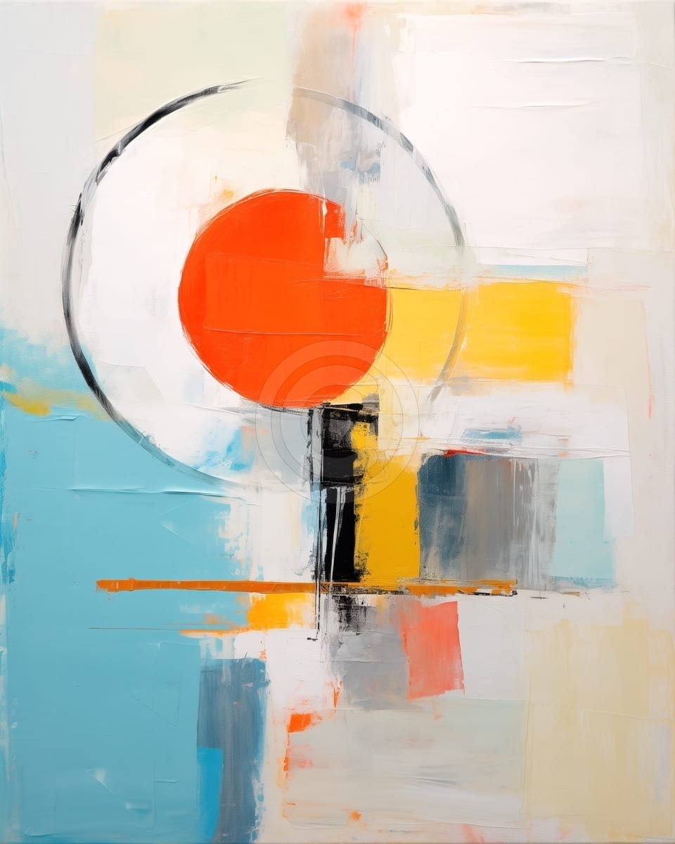 Acest tablou abstract exploreaza armonia formelor geometrice si a culorilor printr-o compozitie centrata pe un cerc rosu intens, inconjurat de un contur circular negru, asezat peste un fundal fragmentat in nuante de bleu, galben, alb, gri si portocaliu. Liniile subtile si blocurile de culoare creeaza o dinamica vizuala echilibrata si moderna. Contrastul dintre culorile calde si reci aduce energie, in timp ce simplitatea compozitiei pastreaza un sentiment de ordine si claritate. Este o alegere ideala pentru interioare contemporane, spatii de birou sau zone de creativitate.