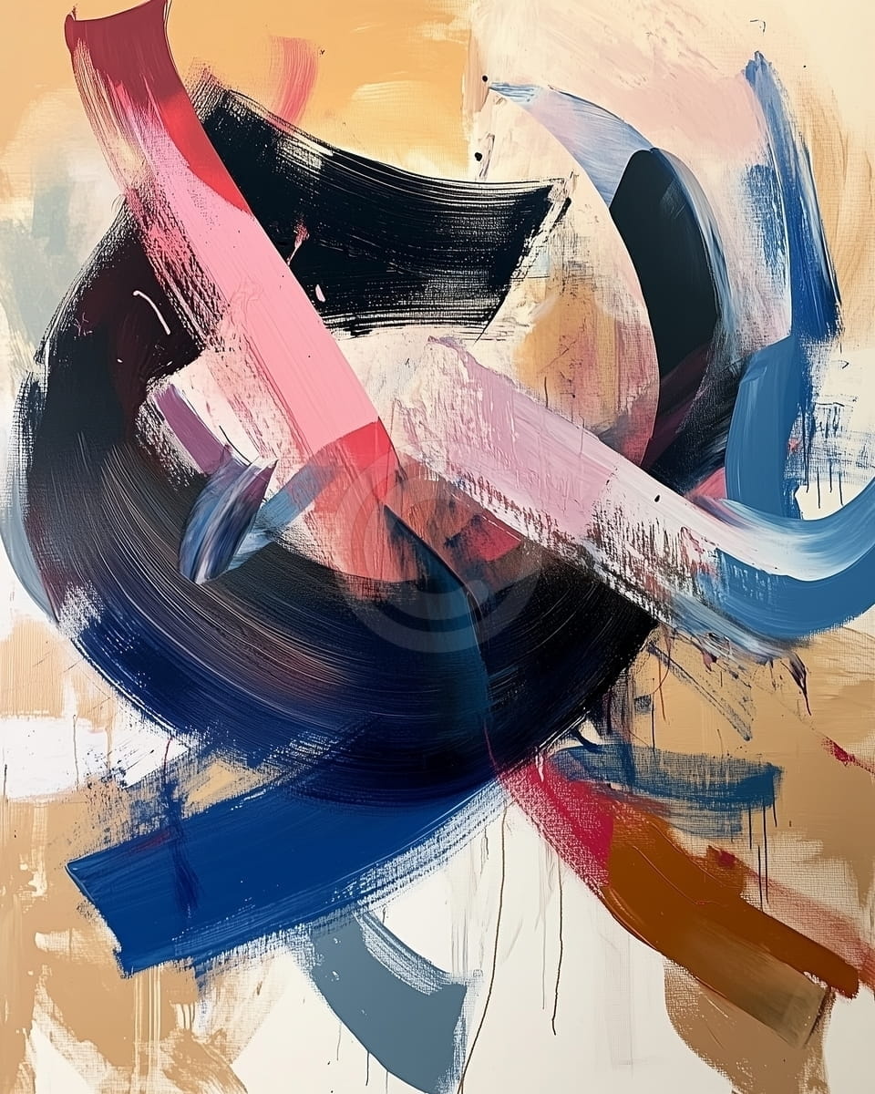 Acest tablou abstract impresioneaza prin miscarile largi, curajoase si fluide ale pensulei, care creeaza o compozitie energica si echilibrata. Nuantele de roz, albastru, negru si caramiziu se intrepatrund pe un fundal bej cald, evocand senzatia unei zile insorite, pline de emotii si spontaneitate. Liniile curbe si dinamica cromatica induc un sentiment de libertate si optimism, sugerand o explozie de energie pozitiva si creativitate.