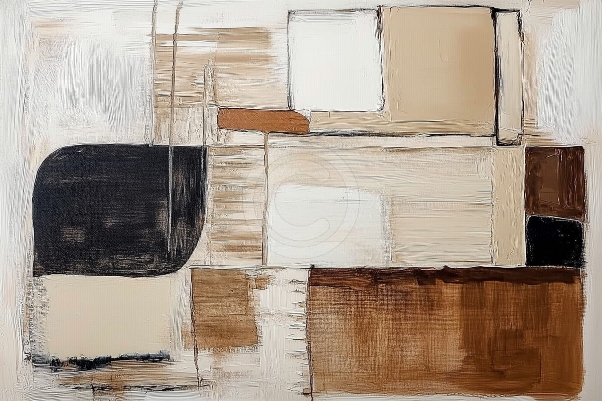 Acest tablou abstract exploreaza echilibrul dintre forme rectangulare si contrastul cromatic subtil, folosind o paleta dominata de alb, bej, crem, negru si tonuri calde de maro. Compozitia este structurata pe orizontala, cu linii fine care delimiteaza fiecare figura geometrica. Textura este variata, cu suprafete netede si accente picturale dense care adauga profunzime si interes vizual. Un element distinctiv este forma rotunjita de culoare neagra din partea stanga, care echilibreaza partea dreapta plina de forme compacte. Lucrarea transmite stabilitate, claritate si eleganta moderna. Este ideala pentru interioare minimaliste sau contemporane.