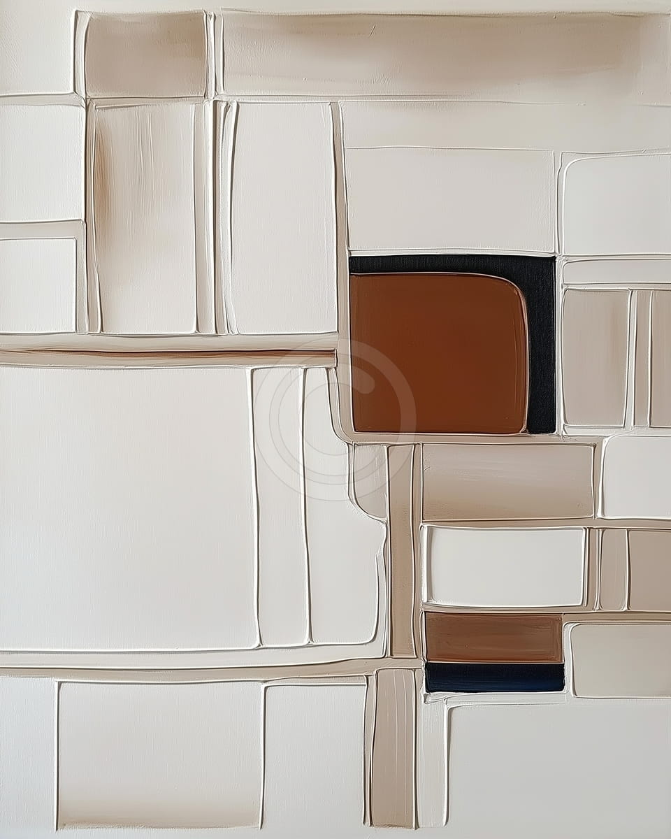 Acest tablou abstract este compus dintr-o retea de forme dreptunghiulare si patrate, bine delimitate prin linii fine in relief, care confera o structura ordonata si echilibrata. Paleta cromatica este dominata de nuante deschise de alb si crem, completate de accente calde de brun si bej, si subliniate de tonuri inchise de negru si albastru foarte inchis. Suprafetele sunt netede, cu o textura fina si uniforma, iar zonele de contrast creeaza un punct focal atragator. Lucrarea transmite ordine, claritate si rafinament discret. Este ideala pentru spatii moderne, aducand o nota de simetrie si eleganta subtila.