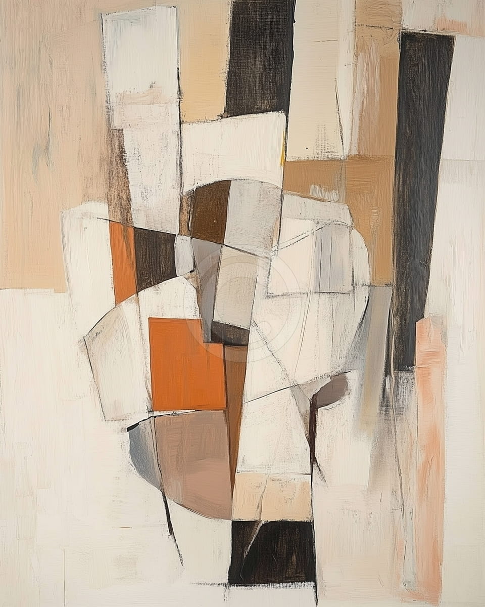 Acest tablou abstract este compus dintr-o multitudine de forme geometrice, dispuse într-o compoziție fragmentată care evocă un colaj urban sau arhitectural. Paleta cromatică include nuanțe calde de crem, bej, maro, portocaliu ars și accente de negru și alb, care creează contraste vizuale puternice. Textura este densă și vizibilă, cu zone pictate în straturi groase și margini conturate expresiv. Lucrarea sugerează mișcare, reconstrucție și echilibru între ordine și haos. Este ideală pentru spații moderne, oferind energie vizuală și profunzime conceptuală.