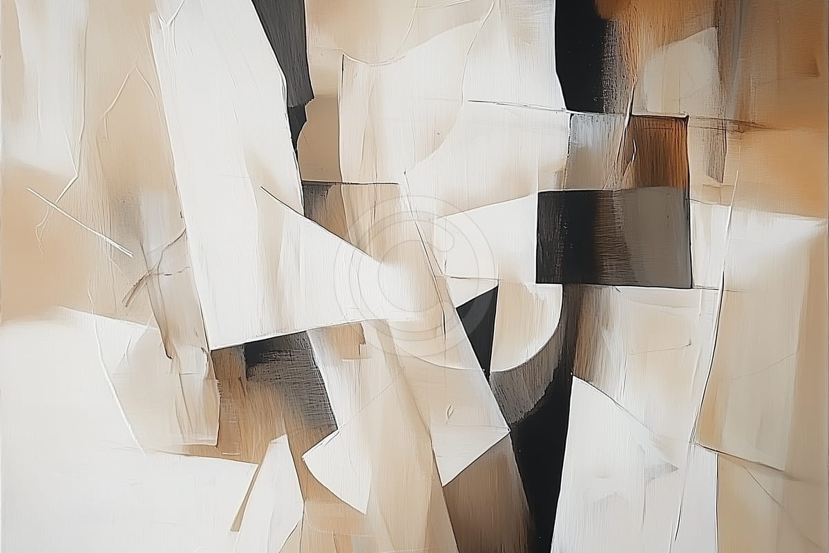 Acest tablou abstract reda o compozitie fragmentata formata din suprafete geometrice deschise la culoare, intersectate de accente negre si ocru cald. Liniile oblice si unghiurile ascutite creeaza senzatia de miscare si adancime, ca si cum bucati de hartie sau panza ar pluti intr-un spatiu neutru. Jocul dintre lumina si umbra aduce un efect dinamic si tridimensional, sugerand structuri fragile si efemere. Cromatica monocroma este echilibrata de textura densa si gestualitatea pensulei. Este o lucrare sofisticata, potrivita pentru spatii moderne sau birouri cu design minimalist.