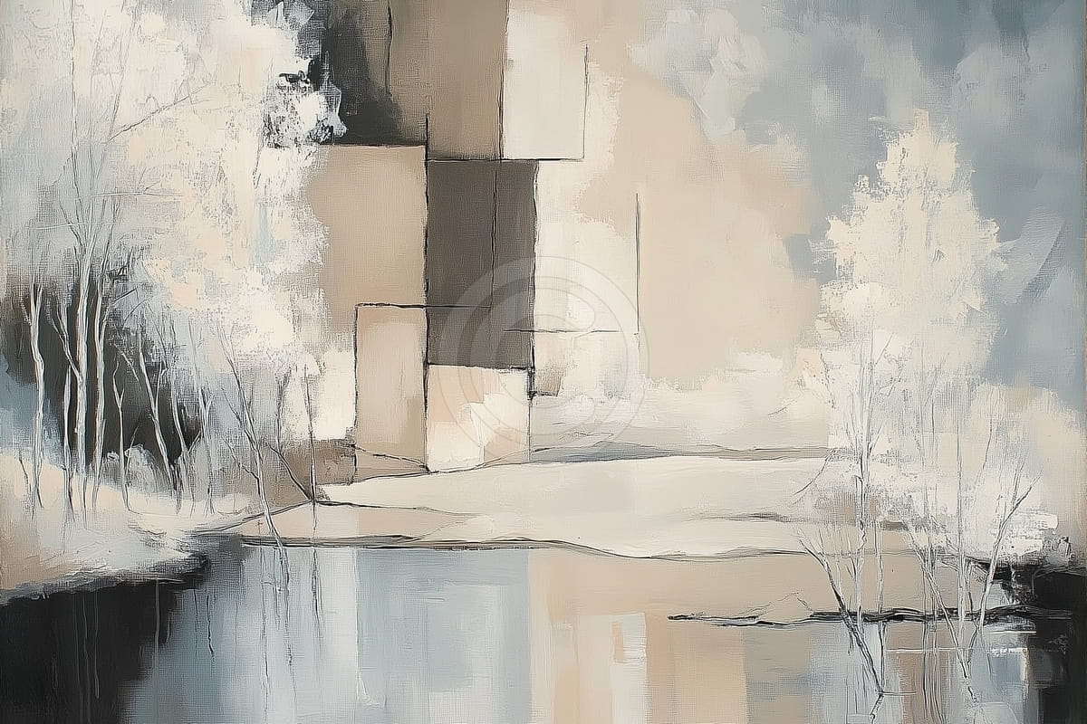 Tabloul surprinde o scena linistita de padure in apropierea unui lac, unde copacii delicati si nuantele pale de bej, gri si alb se oglindesc in apa. Elemente geometrice patrate si dreptunghiulare in fundal adauga un contrast modern peisajului natural. Reflectiile fluide si usoarele tranzitii de culoare creeaza o atmosfera calma si visatoare. Compozitia imbina elemente realiste cu abstractiuni, oferind o interpretare contemporana a naturii. Aceasta lucrare este ideala pentru interioare care doresc un accent linistit, dar sofisticat.
