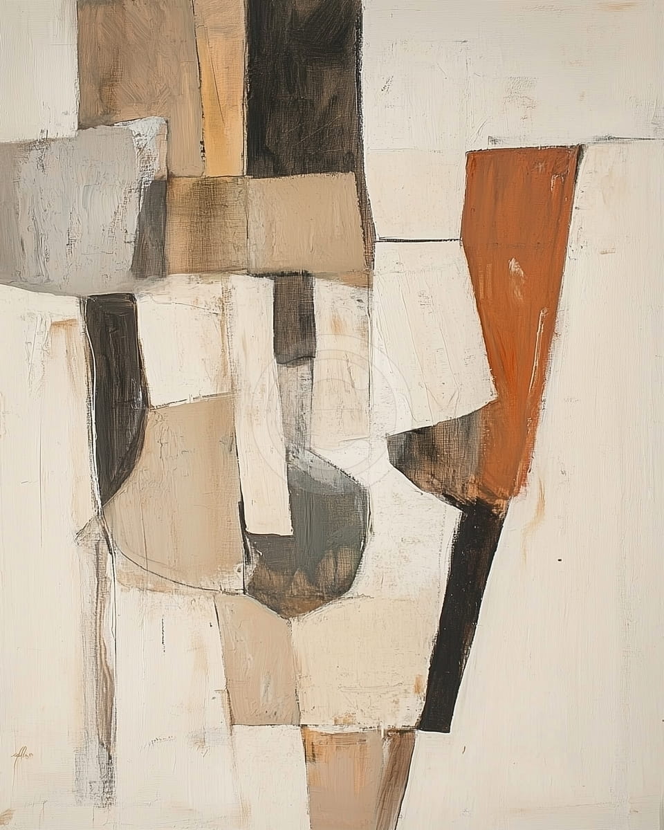 Tabloul prezinta o compozitie abstracta dominata de forme geometrice neregulate si alungite, dispuse vertical pe un fundal crem. Paleta cromatica este calda si echilibrata, incluzand tonuri de bej, maro, alb murdar, negru si un accent caramiziu aprins ce atrage privirea. Textura este evidentiata prin straturi groase de culoare si trasaturi spontane de pensula. Lucrarea creeaza o senzatie de echilibru fragil si miscare subtila, fiind potrivita pentru un spatiu modern si rafinat.