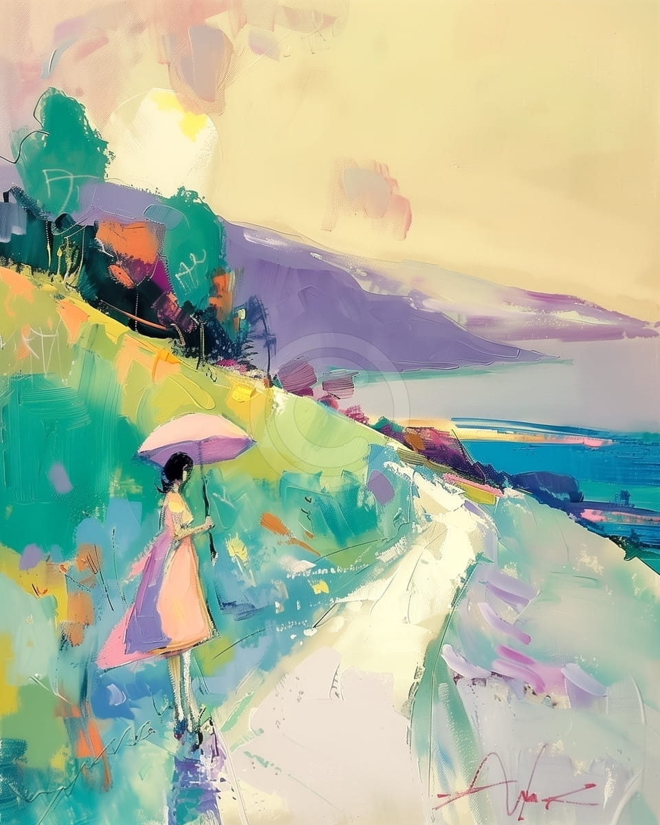Acest tablou abstract prezinta o femeie imbracata intr-o rochie roz, tinand o umbrela, pasind pe un drum luminos ce serpuieste spre mare, intr-un peisaj colinar stilizat. Nuantele vibrante de verde, mov, turcoaz si galben pastel se imbina armonios, creand o atmosfera visatoare si senina. Textura bogata, realizata prin tuse groase si straturi de culoare, adauga profunzime si miscare compozitiei. Scena sugereaza un moment de liniste si contemplare, evocand libertatea si legatura cu natura. Echilibrul dintre culori si forme ofera o senzatie de calm si fluiditate vizuala. Este un tablou potrivit pentru spatii luminoase si personale, unde aduce emotie si rafinament discret.