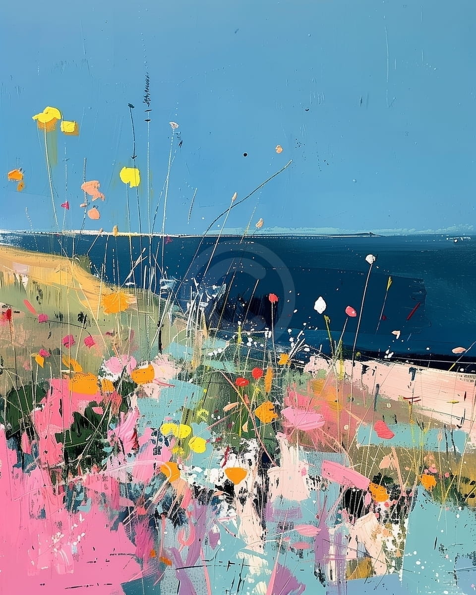 Acest tablou reda un camp de flori salbatice, viu colorate, aflat aproape de mare, sub un cer senin si intens albastru. Nuantele de roz, galben, portocaliu si verde creeaza o explozie de energie si prospetime, in timp ce accentele abstracte sugereaza miscare si libertate. Linia orizontului si contrastul dintre pamant si apa confera echilibru vizual compozitiei. Stilul modern si expresiv amplifica vitalitatea imaginii. Este un tablou ideal pentru un living luminos sau un spatiu de vacanta, transmitand bucurie, optimism si conexiune cu natura.