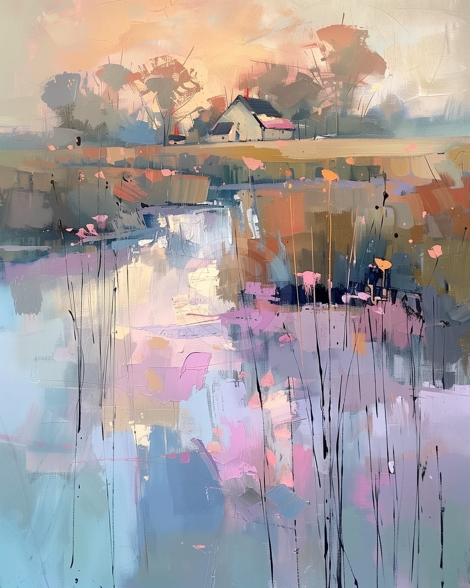 Acest tablou reda o casuta retrasa pe malul unui lac, intr-un peisaj linistit scaldat in lumina calda a apusului. Nuantele pastelate de roz, bleu, lila si galben se intrepatrund armonios, creand o atmosfera visatoare si calma. Reflexiile din apa, impreuna cu tusele fine ale florilor si ierbii, adauga rafinament si profunzime compozitiei. Stilul modern si expresiv, cu accente abstracte si detalii estompate, evidentiaza linistea si intimitatea scenei. Este un tablou ideal pentru dormitor, living sau colturi de lectura, aducand caldura si armonie decorului.