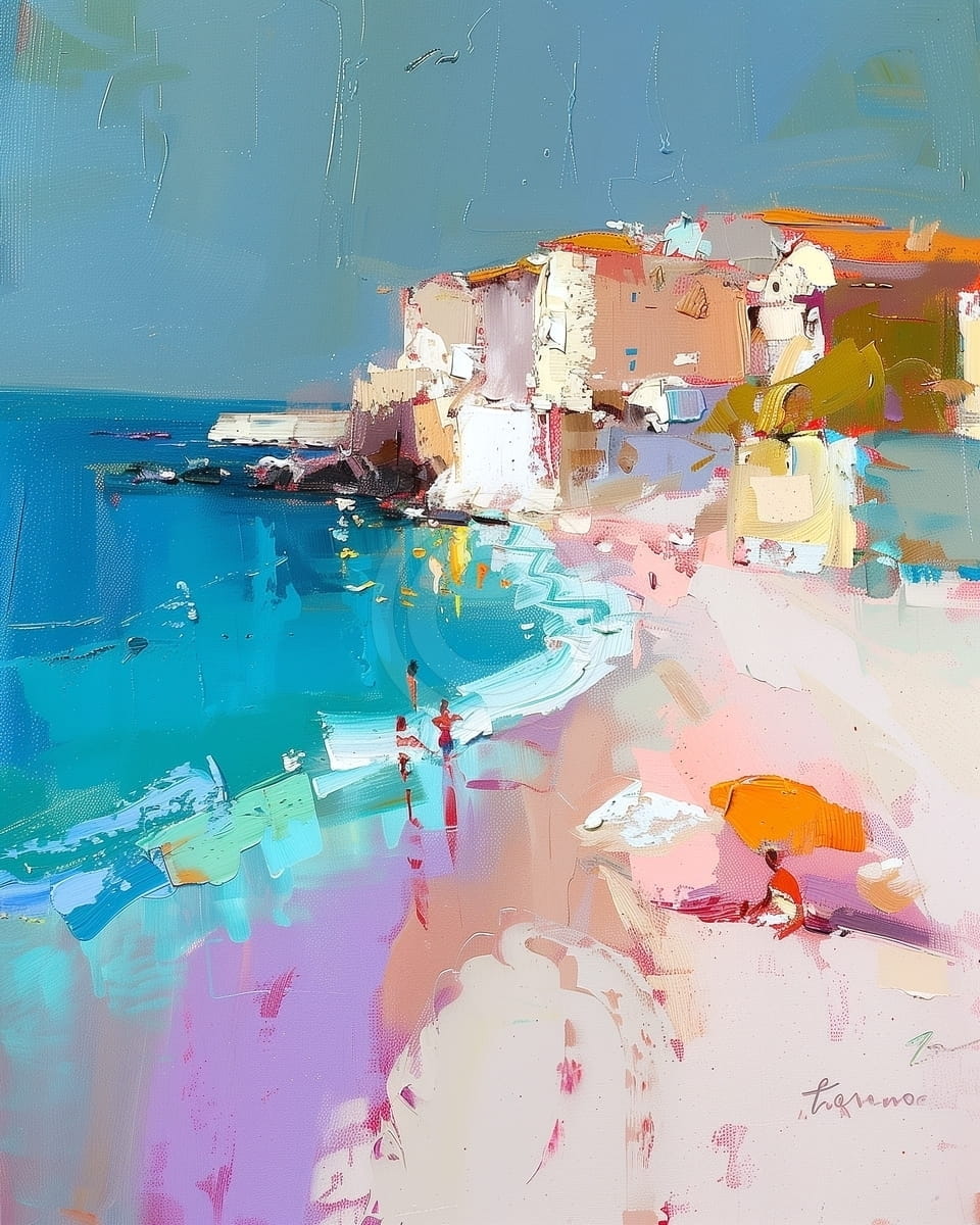 Acest tablou reda o scena estivala vibranta, cu o plaja mediteraneana scaldată in lumina si culoare. Casele din fundal, in tonuri calde de crem si portocaliu, se contureaza pe marginea stancii, in timp ce apa turcoaz se sparge usor pe nisip. In prim-plan, o umbrela portocalie si siluetele oamenilor sugereaza bucuria si relaxarea verii. Stilul modern si expresiv, cu tuse groase si culori vii, adauga dinamism si energie compozitiei. Lucrarea transmite sentimentul de vacanta, libertate si vitalitate. Este ideala pentru livinguri luminoase sau spatii de relaxare cu tema marina.