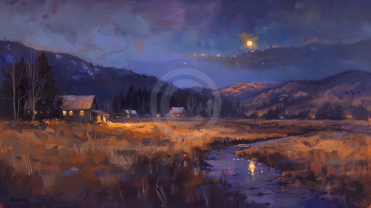 Tabloul arată un peisaj de munte seara, cu lumini calde în căsuțe izolate și un râu care reflectă lumina lunii. Atmosfera este liniștită și primitoare, dând senzația de siguranță. Culorile principale sunt albastru închis și portocaliu, oferind un contrast plăcut. Detaliile sunt pictate clar, cu accente luminoase care fac scena vie. Este potrivit pentru living sau dormitor, aducând confort și calm. Se potrivește celor care iubesc natura și serile liniștite.