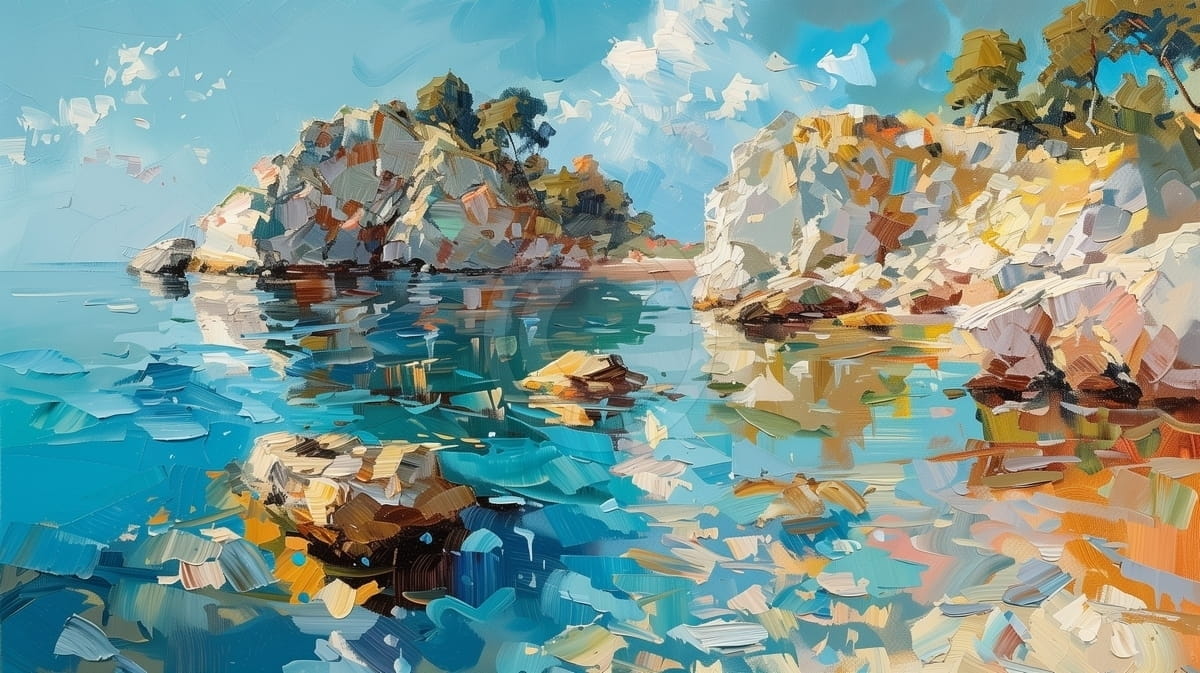 Tabloul arată un peisaj de coastă liniștit, cu stânci albe și vegetație mediteraneană, reflectate în apele clare ale unui mic golf. Nuantele de turcoaz și albastru se amestecă frumos cu tonurile calde ale stâncilor și cerului senin. Pictura are tuse libere și expresive, care dau senzația de mișcare și prospețime. Atmosfera este relaxantă, potrivită pentru locuri de odihnă sau vacanță. Tabloul transmite liniște și dor de mare, fiind ideal pentru un interior luminos și aerisit.