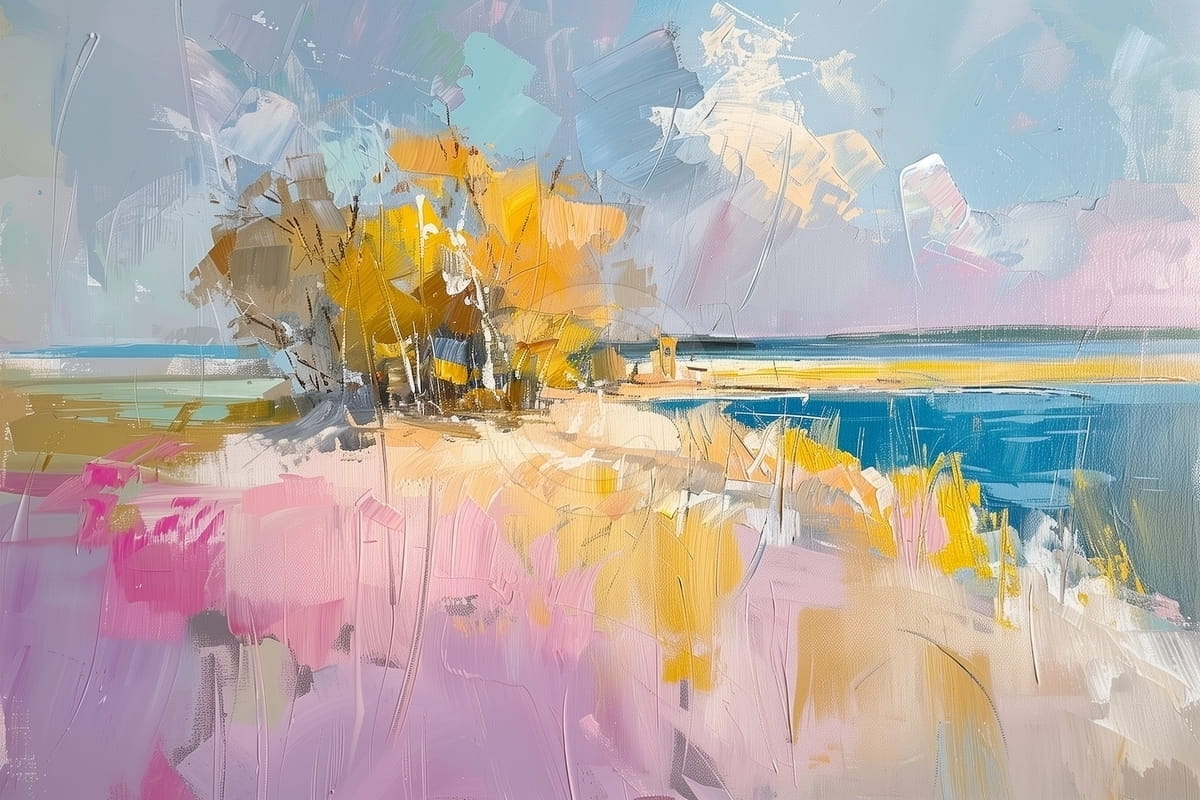 Tabloul reda un peisaj luminos cu campuri si vegetatie colorata, situate langa un rau sau lac. Nuantele vibrante de galben, roz si albastru se imbina armonios, aducand energie si prospetime compozitiei. Vegetatia este schitata expresiv, cu tuse libere si texturi dinamice, iar cerul senin completeaza atmosfera optimista si calma. Aceasta lucrare este potrivita pentru incaperi moderne sau spatii care au nevoie de lumina si vitalitate, adaugand o nota calda si pozitiva decorului.