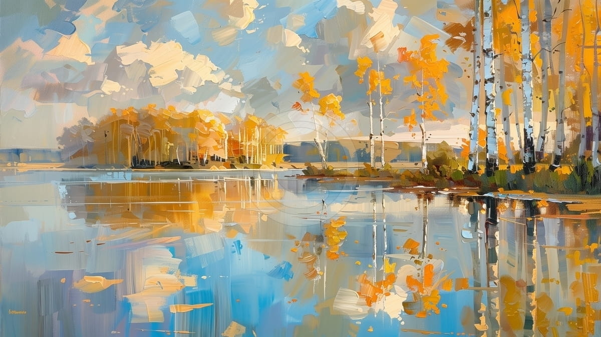 Acest tablou arata un peisaj de toamna luminos, cu copaci cu frunze galben-aurii care se reflecta intr-un lac linistit. Cerul este in nuante calde de albastru si crem, completand frumos imaginea. Tusele sunt groase si vizibile, ceea ce da mai multa viata tabloului. Reflexiile din apa sunt redate cu atentie si scot in evidenta frumusetea locului. Tabloul transmite calm si echilibru. Este potrivit pentru un living sau un birou, unde poate aduce o stare placuta si relaxanta, apropiata de natura.