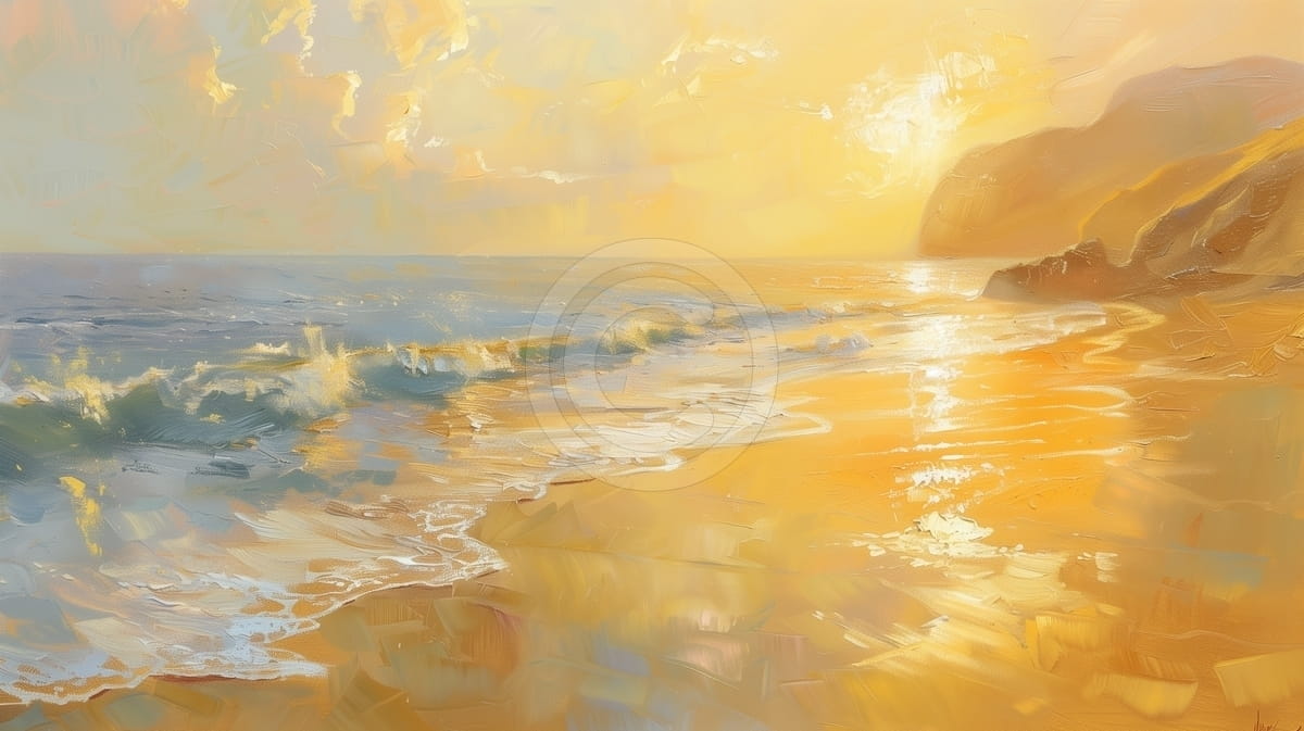 Acest tablou peisagistic surprinde un apus spectaculos pe malul marii, unde lumina calda a soarelui se reflecta in valuri si nisip intr-o armonie de nuante aurii, portocalii si albastre. Tusele largi si expresive redau cu delicatete spuma valurilor si stralucirea apei, creand o atmosfera senina si romantica. Conturul stancos al tarmului adauga profunzime si echilibru compozitiei. Lucrarea emana caldura, liniste si libertate, fiind ideala pentru livinguri, spatii de relaxare sau incaperi decorate in stil mediteranean.