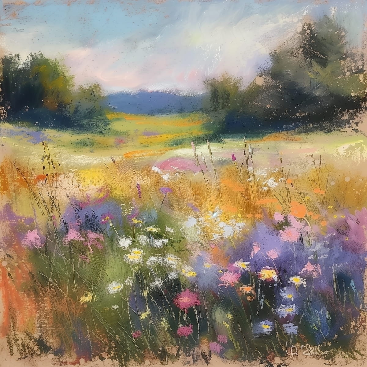 Acest tablou surprinde un camp vibrant de flori salbatice in plina vara, cu margarete, maci si alte flori in nuante de alb, portocaliu, roz si violet. Pe fundal, peisajul se deschide spre coline domoale si paduri verzi, sub un cer senin in nuante pastelate. Compozitia este plina de lumina si miscare, cu pensulatii libere si texturi fine care sugereaza adierea vantului. Tabloul transmite o senzatie de liniste, libertate si bucurie simpla, evocand o zi senina petrecuta in mijlocul naturii.