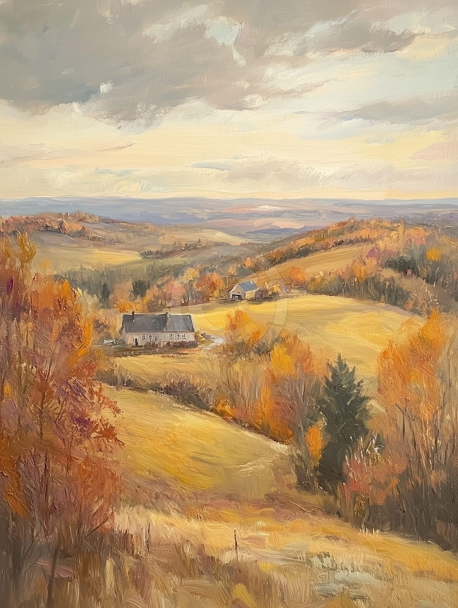 Tabloul reda un peisaj rural clasic de toamna, cu coline aurii si paduri in nuante calde de ruginiu, portocaliu si galben. In centrul compozitiei se afla cateva case izolate, care adauga un sentiment de liniste si apartenenta. Cerul acoperit de nori moi sugereaza un moment de calm dintr-o dupa-amiaza tarzie. Tusele de pensula sunt moi si fluide, conferind o atmosfera picturala romantica si realista. Profunzimea este excelent realizata prin suprapunerea distantelor si a culorilor atenuate in fundal. Lucrarea este perfecta pentru interioare rustice sau clasice, evocand traditie, liniste si farmecul vietii simple la tara.