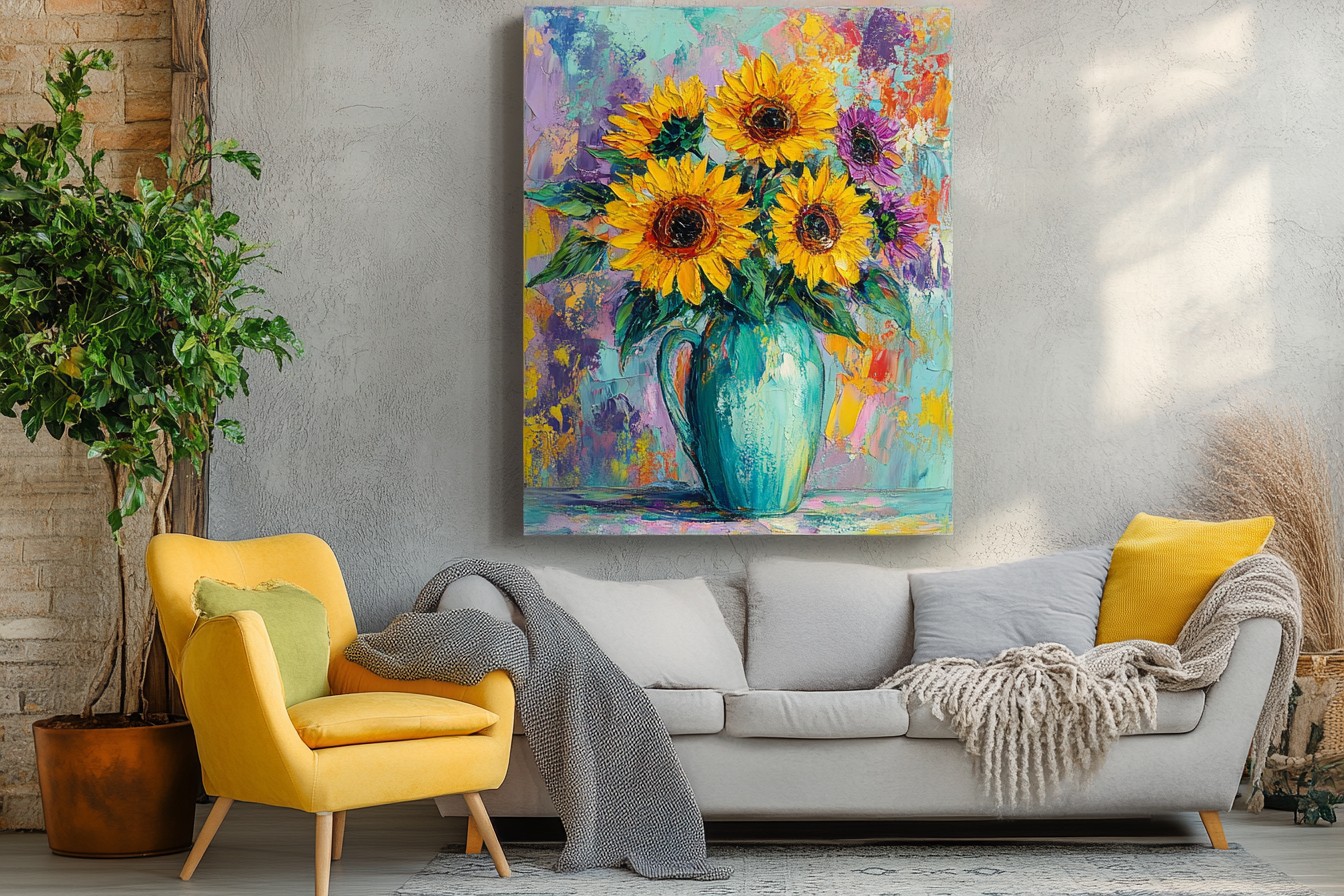 Exploreaza pe canvasart o colectie de tablouri cu floarea-soarelui, inspirate de frumusetea si lumina acestor flori pline de energie. Culorile calde si pensulatia expresiva pun in valoare galbenul intens al petalelor si atmosfera luminoasa pe care o transmit aceste imagini. Un astfel de tablou aduce mai multa caldura si vitalitate peretilor, inviorand usor decorul incaperii. Florile de floarea-soarelui sunt asociate cu optimismul si lumina verii, ceea ce le face potrivite pentru diferite tipuri de interioare. Aceste tablouri se potrivesc foarte bine atat in locuinte, cat si in birouri. In acest fel, spatiul capata mai multa culoare si o atmosfera plina de buna dispozitie.